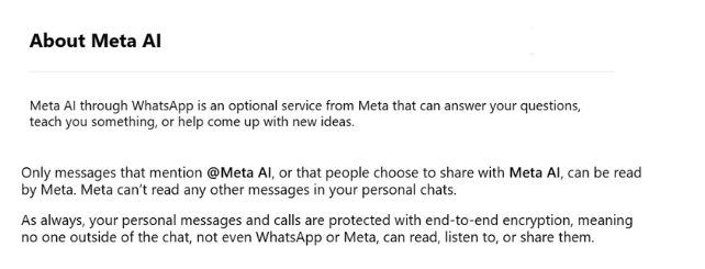 ਮੈਟਾ ਏਆਈ ਬਾਰੇ ਵਿਸਥਾਰ ਵਿੱਚ ਦੱਸਦੇ ਹੋਏ, ਵਟਸਐਪ ਦੱਸਦਾ ਹੈ ਕਿ ਇਹ ਇੱਕ ਵਿਕਲਪਿਕ ਸੇਵਾ ਹੈ ਜੋ ਉਪਭੋਗਤਾਵਾਂ ਦੁਆਰਾ ਭੇਜੇ ਗਏ ਸੰਦੇਸ਼ਾਂ/ਪ੍ਰੋਂਪਟਾਂ ਦਾ ਜਵਾਬ ਦਿੰਦੀ ਹੈ। ਉਪਭੋਗਤਾਵਾਂ ਕੋਲ ਏਆਈ ਟੂਲ ਨਾਲ ਅਜਿਹੀਆਂ ਚੈਟਾਂ ਨੂੰ ਡਿਲੀਟ ਦਾ ਵਿਕਲਪ ਵੀ ਹੈ।