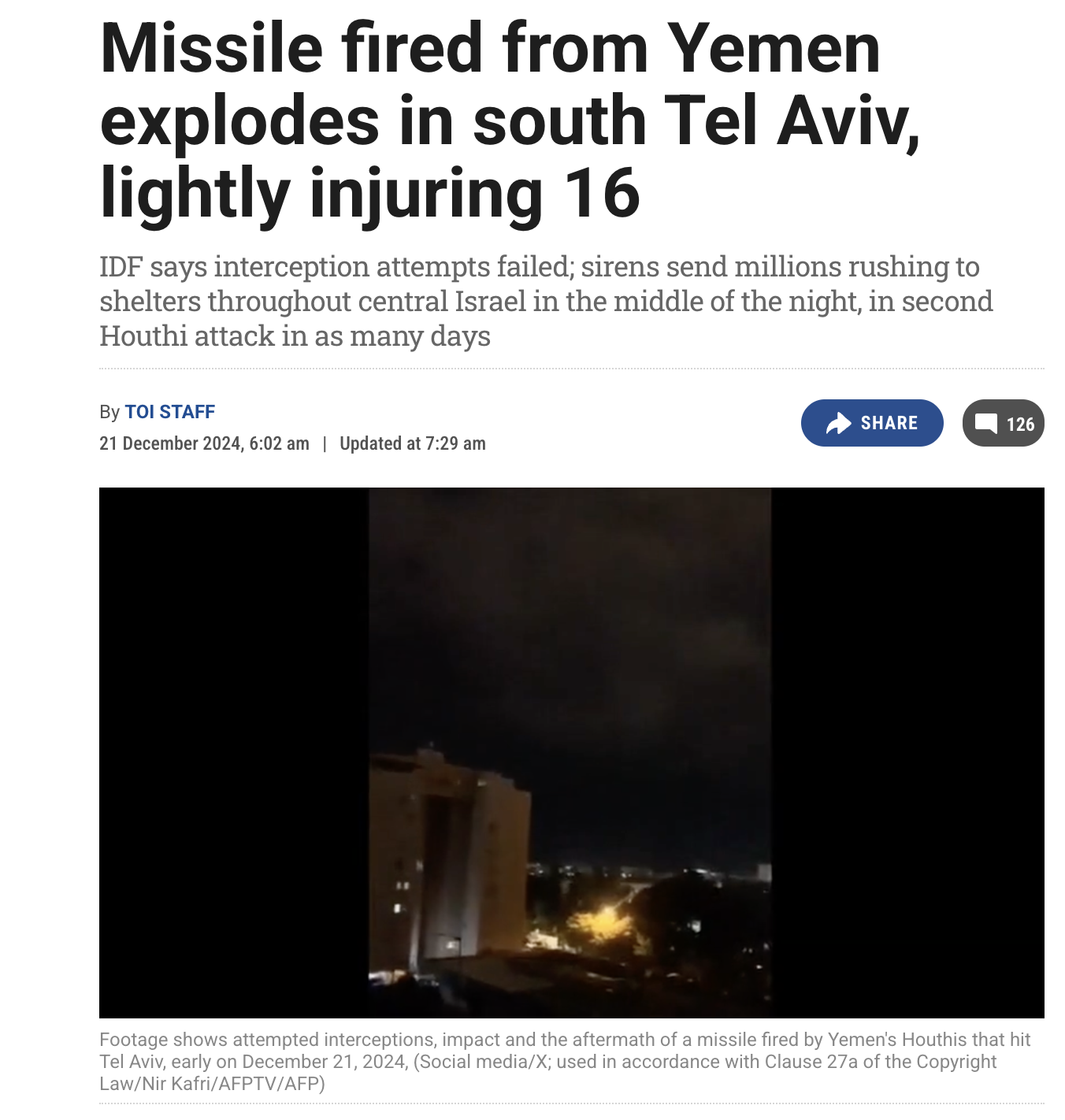 ਟਾਈਮ ਆਫ ਇਜਰਾਇਲ ਦੀ ਰਿਪੋਰਟ ਦੇ ਮੁਤਾਬਕ ਯਮਨ ਦੇ ਹੋਥੀ ਵਿਦ੍ਰੋਹੀਆਂ ਦੁਆਰਾ ਦਾਗੀ ਗਈ ਮਿਜਾਇਲ ਸ਼ੁਕਰਵਾਰ ਸ਼ਨੀਵਾਰ ਦੀ ਰਾਤ ਨੂੰ ਦੱਖਣੀ ਤੇਲ ਅਵੀਵ ਦੇ ਇੱਕ ਜਨਤਕ ਪਾਰਕ ਵਿੱਚ ਫਟ ਗਈ। ਇਜਰਾਇਲ ਦੁਆਰਾ ਇਸ ਮਿਜਾਇਲ ਨੂੰ ਰੋਕਣ ਦੀਆਂ ਕੋਸ਼ਿਸ਼ਾਂ ਅਸਫਲ ਰਹੀਆਂ। ਡਾਕਟਰਾਂ ਦੇ ਮੁਤਾਬਕ ਤਕਰੀਬਨ 16 ਵਿਅਕਤੀ ਇਸ ਘਟਨਾ ਵਿੱਚ ਜਖਮੀ ਹੋਏ ਹਨ।