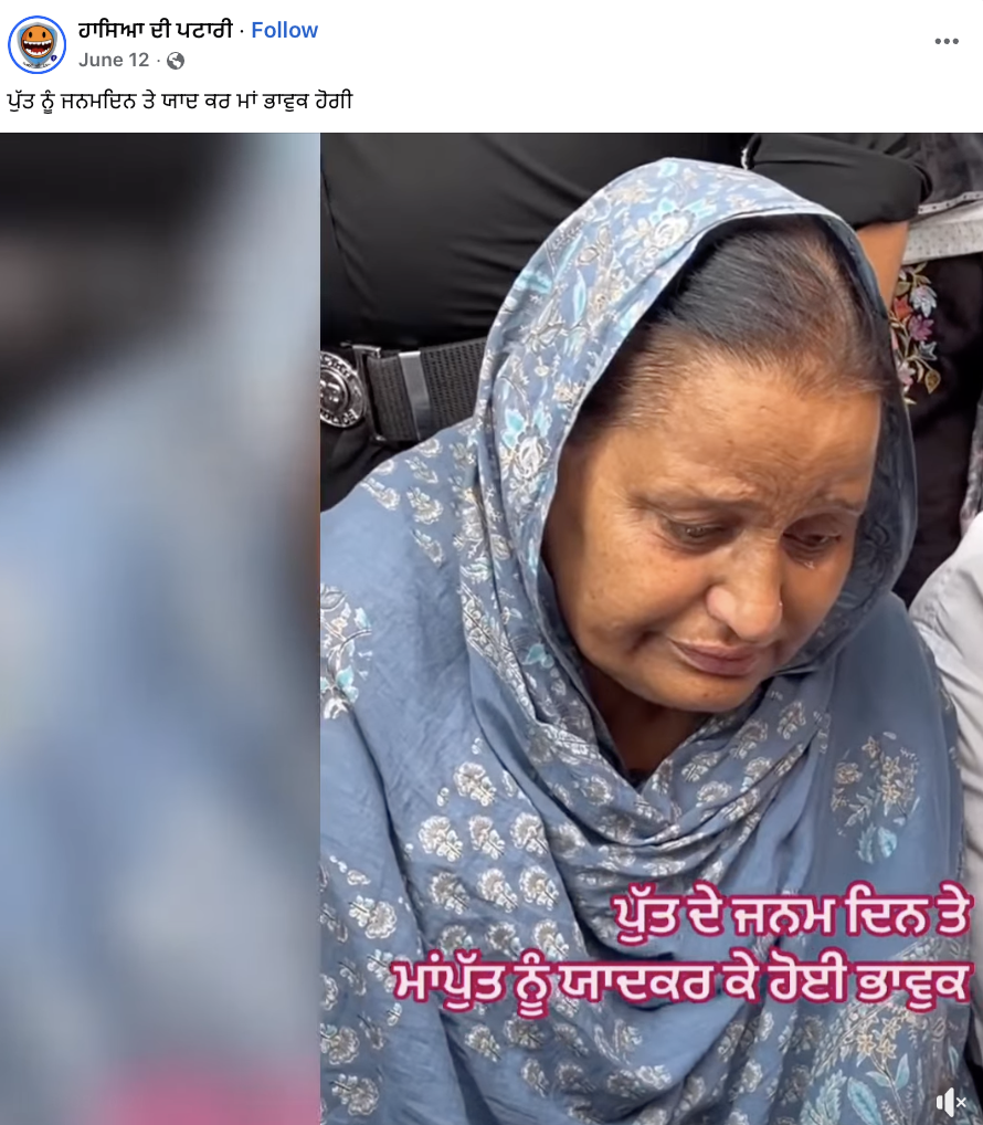 ਸਰਚ ਦੇ ਦੌਰਾਨ ਸਾਨੂੰ ਵਾਇਰਲ ਹੋ ਰਹੀ ਵੀਡੀਓ ਫੇਸਬੁੱਕ ਪੇਜ “ਹਾਸਿਆਂ ਦੀ ਪਟਾਰੀ” ਤੇ ਜੂਨ 12, 2025 ਨੂੰ ਅਪਲੋਡ ਮਿਲੀ। ਵੀਡੀਓ ਦੇ ਕੈਪਸ਼ਨ ਦੇ ਮੁਤਾਬਕ,”ਪੁੱਤ ਨੂੰ ਜਨਮਦਿਨ ਤੇ ਯਾਦ ਕਰ ਮਾਂ ਭਾਵੁਕ ਹੋਗੀ”