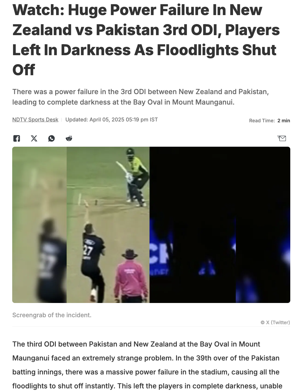 ਰਿਪੋਰਟ ਵਿੱਚ ਦੱਸਿਆ ਗਿਆ ਸੀ ਕਿ 5 ਅਪ੍ਰੈਲ, 2025 ਨੂੰ ਮਾਊਂਟ ਮੌਂਗਾਨੁਈ (ਨਿਊਜ਼ੀਲੈਂਡ) ਦੇ ਬੇ ਓਵਲ ਵਿਖੇ ਪਾਕਿਸਤਾਨ ਅਤੇ ਨਿਊਜ਼ੀਲੈਂਡ ਵਿਚਕਾਰ ਤੀਜੇ ਵਨਡੇ ਦੌਰਾਨ ਬਹੁਤ ਹੀ ਅਜੀਬ ਸਮੱਸਿਆ ਦਾ ਸਾਹਮਣਾ ਕਰਨਾ ਪਿਆ ਜਦੋਂ ਪਾਕਿਸਤਾਨ ਦੀ ਬੱਲੇਬਾਜ਼ੀ ਪਾਰੀ ਦੇ 39ਵੇਂ ਓਵਰ ਵਿੱਚ, ਸਟੇਡੀਅਮ ਵਿੱਚ ਸਾਰੀਆਂ ਫਲੱਡ ਲਾਈਟਾਂ ਤੁਰੰਤ ਬੰਦ ਹੋ ਗਈਆਂ। ਰਿਪੋਰਟਾਂ ਇੱਥੇ, ਇੱਥੇ, ਅਤੇ ਇੱਥੇ ਵੇਖੀਆਂ ਜਾ ਸਕਦੀਆਂ ਹਨ।