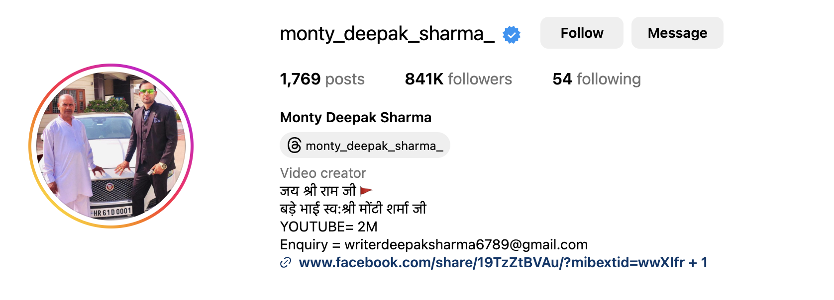 ਆਪਣੀ ਪੜਤਾਲ ਨੂੰ ਅੱਗੇ ਵਧਾਉਂਦੇ ਹੋਏ ਅਸੀਂ ਇਸ ਯੂ ਟੀਊਬ ਹੈਂਡਲ ਦੇ ਅਬਾਉਟ ਸੈਕਸ਼ਨ ਨੂੰ ਖੰਗਾਲਿਆ। ਅਸੀਂ ਪਾਇਆ ਕਿ ਮੌਂਟੀ ਦੀਪਕ ਸ਼ਰਮਾ ਨੇ ਆਪਣੇ ਸੋਸ਼ਲ ਮੀਡੀਆ ਹੈਂਡਲ ਤੇ ਵੀਡੀਓ ਕਰੇਟਰ ਲਿਖਿਆ ਹੈ।
