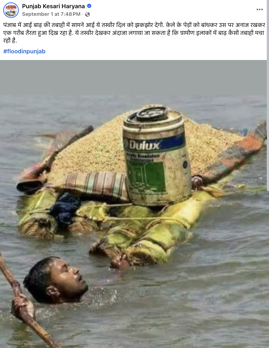 ਪੰਜਾਬ ਵਿੱਚ ਹੜ੍ਹ ਦੇ ਵਿਚਾਲੇ ਸੋਸ਼ਲ ਮੀਡਿਆ ਤੇ ਇੱਕ ਤਸਵੀਰਵਾਇਰਲ ਹੋ ਰਹੀ ਹੈ ਜਿਸ ਵਿੱਚ ਵਿਅਕਤੀ ਨੂੰ ਹੜ੍ਹ ਦੇ ਵਿਚਕਾਰ ਬੇੜੀ ‘ਤੇ ਅਨਾਜ਼ ਲਿਜਾਂਦਿਆਂ ਦੇਖਿਆ ਜਾ ਸਕਦਾ ਹੈ। ਇਸ ਤਸਵੀਰ ਨੂੰ ਸ਼ੇਅਰ ਕਰ ਦਾਅਵਾ ਕੀਤਾ ਜਾ ਰਿਹਾ ਹੈ ਕਿ ਇਹ ਤਸਵੀਰ ਹਾਲ ਹੀ ਵਿੱਚ ਪੰਜਾਬ ‘ਚ ਆਏ ਹੜ੍ਹ ਦੀ ਹੈ। ਮੀਡਿਆ ਅਦਾਰਾ ਪੰਜਾਬ ਕੇਸਰੀ ਹਰਿਆਣਾ ਨੇ ਇਸ ਤਸਵੀਰ ਨੂੰ ਪੰਜਾਬ ਦਾ ਦੱਸਦਿਆਂ ਸ਼ੇਅਰ ਕੀਤਾ।