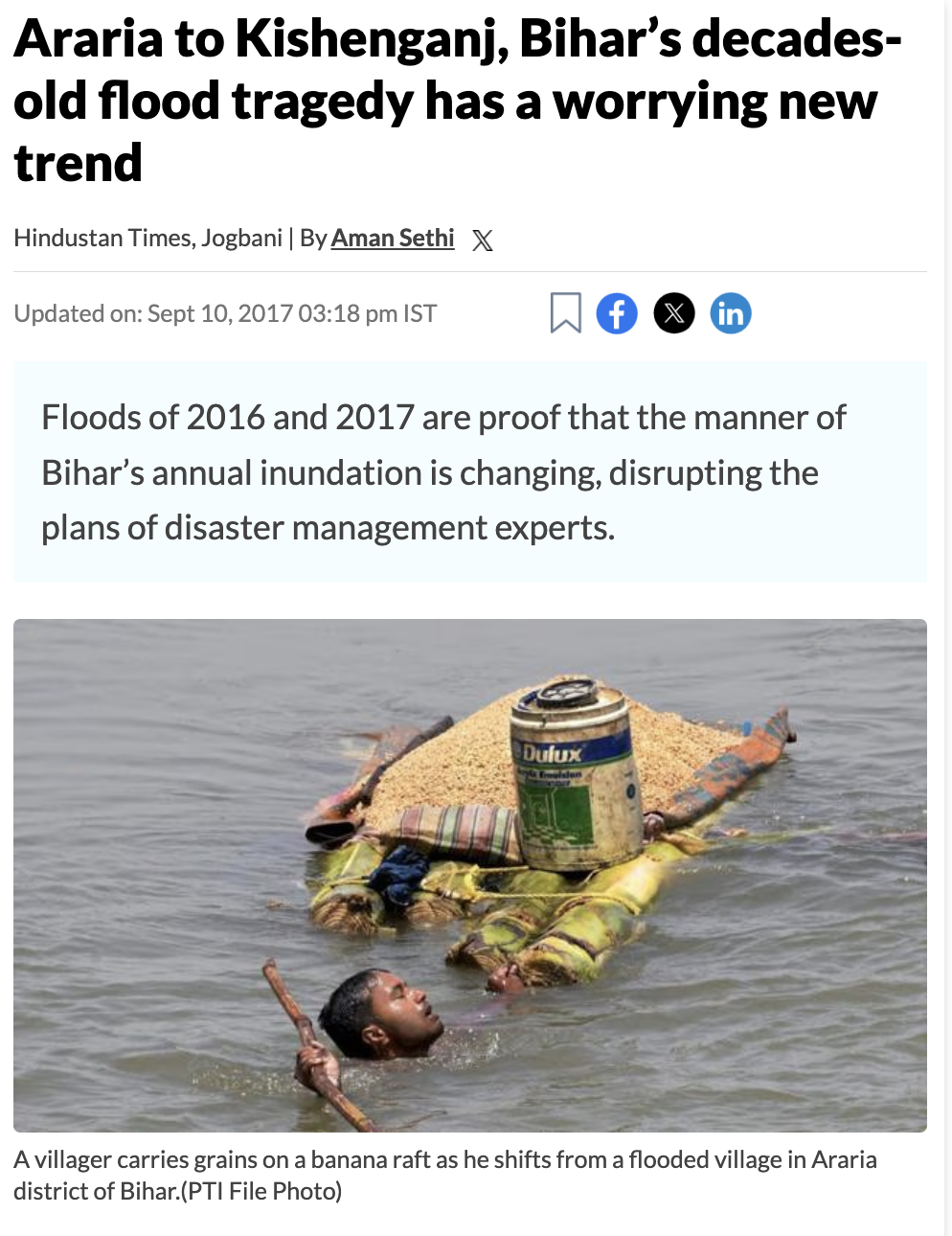 ਸਾਨੂੰ ਇਹ ਤਸਵੀਰ ਮੀਡਿਆ ਅਦਾਰਾ ਸਕਰੋਲ ਤੇ ਵੀ ਸਿਤੰਬਰ 10, 2017 ਨੂੰ ਅਪਲੋਡ ਮਿਲੀ। ਇਸ ਰਿਪੋਰਟ ਦੇ ਮੁਤਾਬਕ ਵੀ ਇਹ ਤਸਵੀਰ ਬਿਹਾਰ ਦੇ ਅਰਰਿਆ ਦੀ ਹੈ। ਤਸਵੀਰ ਦੇ ਲਈ ਕਰੈਡਿਟ ਪੀਟੀਆਈ ਨੂੰ ਦਿੱਤਾ ਗਿਆ ਹੈ।