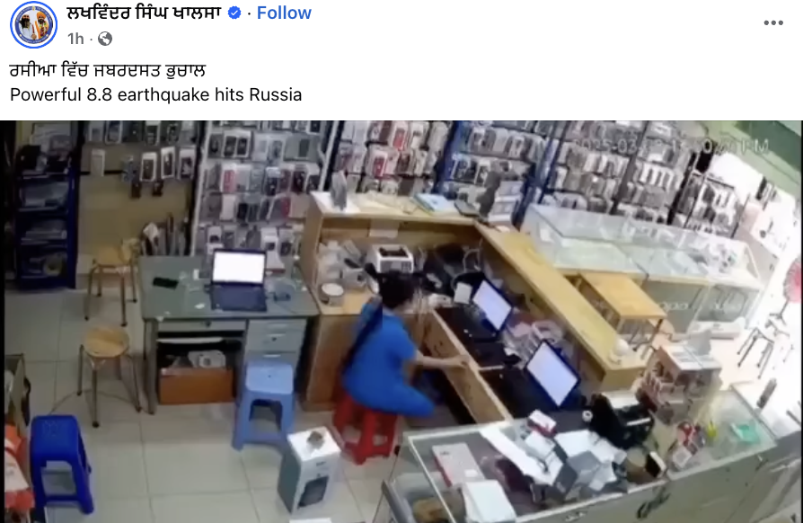 ਸੋਸ਼ਲ ਮੀਡਿਆ ਤੇ ਵਾਇਰਲ ਹੋ ਰਹੀ ਇਸ ਸੀਸੀਟੀਵੀ ਵੀਡੀਓ ਦੇ ਵਿੱਚ ਦੁਕਾਨ ਤੇ ਬੈਠੀ ਮਹਿਲਾ ਨੂੰ ਭੂਚਾਲ ਆਉਣ ਤੋਂ ਬਾਅਦ ਆਪਣਾ ਬਚਾਵ ਕਰਦਿਆਂ ਦੇਖਿਆ ਜਾ ਸਕਦਾ ਹੈ। ਵੀਡੀਓ ਵਿੱਚ ਦੇਖਿਆ ਜਾ ਸਕਦਾ ਹੈ ਕਿ ਮਹਿਲਾ ਭੂਚਾਲ ਦੌਰਾਨ ਡਿੱਗਦੀਆਂ ਸ਼ੈਲਫਾਂ ਅਤੇ ਅਲਮਾਰੀਆਂ ਤੋਂ ਬਚਣ ਲਈ ਇੱਕ ਮੇਜ਼ ਦੇ ਹੇਠਾਂ ਲੁਕ ਗਈ। ਦਾਅਵਾ ਕੀਤਾ ਜਾ ਰਿਹਾ ਹੈ ਕਿ ਇਹ ਵੀਡੀਓ ਰੂਸ ਵਿੱਚ ਆਏ ਭੂਚਾਲ ਦੀ ਹੈ।