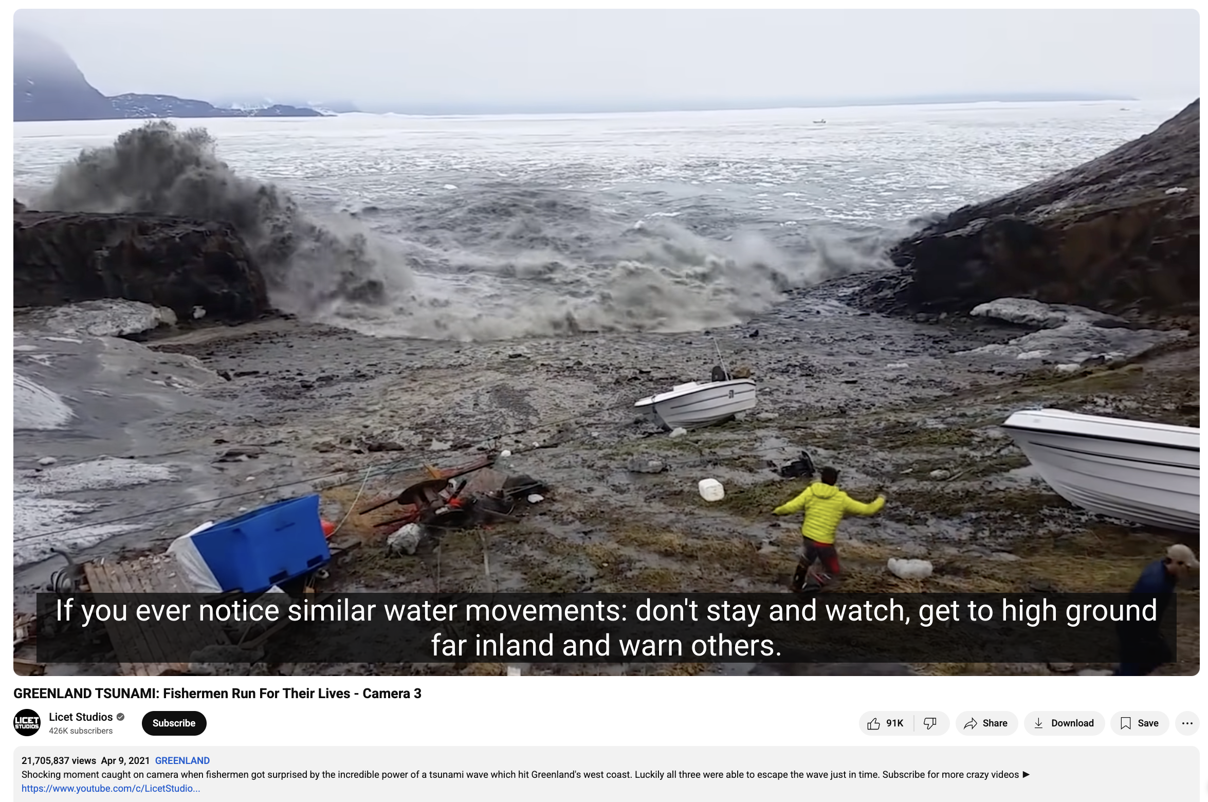 ਸਰਚ ਦੇ ਦੌਰਾਨ ਸਾਨੂੰ ਇਹ ਵੀਡੀਓ Licet Studios ਦੁਆਰਾ ਅਪ੍ਰੈਲ 9, 2021 ਨੂੰ ਅਪਲੋਡ ਮਿਲੀ। ਇਸ ਵੀਡੀਓ ਦੇ ਕੈਪਸ਼ਨ ਦੇ ਮੁਤਾਬਕ ਇਹ ਵੀਡੀਓ ਜੂਨ 17, 2017 ਨੂੰ ਗ੍ਰੀਨਲੈਂਡ ਵਿੱਚ ਆਈ ਸੁਨਾਮੀ ਦੀ ਹੈ।