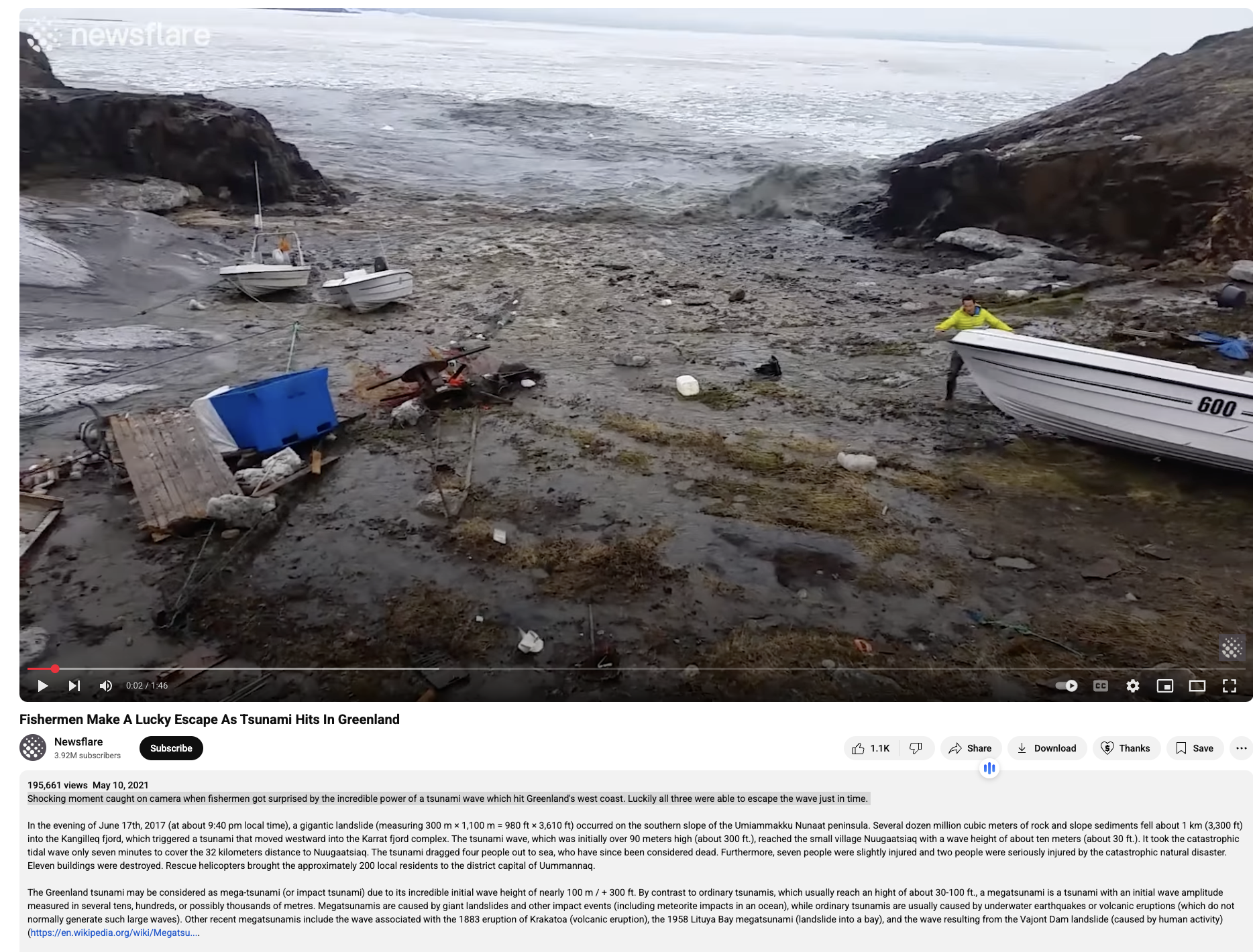 ਇਸ ਵੀਡੀਓ ਵਿੱਚ ਦਿੱਤੀ ਗਈ ਜਾਣਕਾਰੀ ਦੇ ਮੁਤਾਬਕ, 17 ਜੂਨ, 2017 ਦੀ ਸ਼ਾਮ ਨੂੰ ਉਮਿਆਮੱਕੂ ਨੁਨਾਟ ਪ੍ਰਾਇਦੀਪ ਦੇ ਦੱਖਣੀ ਢਲਾਨ ‘ਤੇ ਇੱਕ ਵਿਸ਼ਾਲ ਜ਼ਮੀਨ ਖਿਸਕ ਗਈ। ਸੁਨਾਮੀ ਲਹਿਰ, ਜੋ ਸ਼ੁਰੂ ਵਿੱਚ 90 ਮੀਟਰ ਤੋਂ ਵੱਧ ਉੱਚੀ (ਲਗਭਗ 300 ਫੁੱਟ) ਸੀ, ਛੋਟੇ ਜਿਹੇ ਪਿੰਡ ਨੂਗਾਤਸਿਆਕ ਤੱਕ ਪਹੁੰਚੀ ਜਿਸ ਦੌਰਾਨ ਲਹਿਰ ਦੀ ਉਚਾਈ ਲਗਭਗ ਦਸ ਮੀਟਰ (ਲਗਭਗ 30 ਫੁੱਟ) ਸੀ। ਨੂਗਾਤਸਿਆਕ ਤੱਕ 32 ਕਿਲੋਮੀਟਰ ਦੀ ਦੂਰੀ ਨੂੰ ਪੂਰਾ ਕਰਨ ਲਈ ਇਸ ਭਿਆਨਕ ਸਮੁੰਦਰੀ ਲਹਿਰ ਨੂੰ ਸਿਰਫ਼ ਸੱਤ ਮਿੰਟ ਲੱਗੇ। ਇਹ ਸੁਨਾਮੀ ਚਾਰ ਲੋਕਾਂ ਨੂੰ ਸਮੁੰਦਰ ਵਿੱਚ ਖਿੱਚ ਕੇ ਲੈ ਗਈ, ਜਿਨ੍ਹਾਂ ਨੂੰ ਉਦੋਂ ਤੋਂ ਮ੍ਰਿਤਕ ਮੰਨਿਆ ਜਾ ਰਿਹਾ ਹੈ। ਇਸ ਤੋਂ ਇਲਾਵਾ, ਇਸ ਭਿਆਨਕ ਕੁਦਰਤੀ ਆਫ਼ਤ ਕਾਰਨ ਸੱਤ ਲੋਕ ਜ਼ਖਮੀ ਹੋਏ ਸਨ ਅਤੇ ਦੋ ਲੋਕ ਗੰਭੀਰ ਰੂਪ ਵਿੱਚ ਜ਼ਖਮੀ ਹੋਏ ਸਨ। ਗਿਆਰਾਂ ਇਮਾਰਤਾਂ ਤਬਾਹ ਹੋ ਗਈਆਂ। ਬਚਾਅ ਹੈਲੀਕਾਪਟਰਾਂ ਨੇ ਲਗਭਗ 200 ਸਥਾਨਕ ਨਿਵਾਸੀਆਂ ਨੂੰ ਉਮਮਾਨਕ ਦੀ ਜ਼ਿਲ੍ਹਾ ਰਾਜਧਾਨੀ ਪਹੁੰਚਾਇਆ।