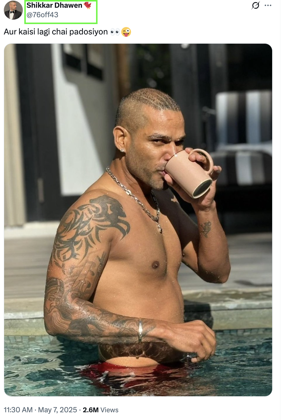 ਇਸ ਵਿੱਚ ਸੋਸ਼ਲ ਮੀਡੀਆ ਤੇ ਭਾਰਤੀ ਕ੍ਰਿਕਟਰ ਸ਼ਿਖਰ ਧਵਨ ਦੀ ਪੋਸਟ ਵਾਇਰਲ ਹੋ ਰਹੀ ਹੈ ਜਿਸ ਵਿੱਚ ਉਹ ਸਵਿਮਿੰਗ ਪੂਲ ਵਿੱਚ ਖੜੇ ਕੁਝ ਪੀਂਦੇ ਦਿਖਾਈ ਦੇ ਰਹੇ ਹਨ। ਪੋਸਟ ਨੂੰ ਸ਼ੇਅਰ ਕਰ ਦਾਅਵਾ ਕੀਤਾ ਜਾ ਰਿਹਾ ਹੈ ਕਿ ਆਪਰੇਸ਼ਨ ਸਿੰਦੂਰ ਤੋਂ ਬਾਅਦ ਸ਼ਿਖਰ ਧਵਨ ਨੇ ਪਾਕਿਸਤਾਨ ਤੇ ਤੰਜ ਕਸਦਿਆਂ ਲਿਖਿਆ,”ਚਾਹ ਕਿਵੇਂ ਦੀ ਲੱਗੀ ਗੁਆਂਡਿਓ।”