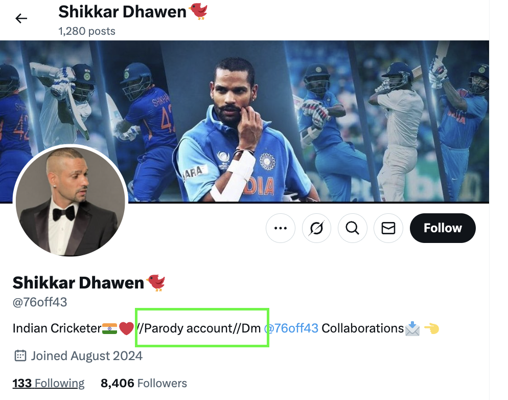 ਹੁਣ ਅਸੀਂ ਵਾਇਰਲ ਹੋ ਰਹੀ ਪੋਸਟ ਵਿੱਚ ਦਿਖ ਰਹੇ ਅਕਾਊਂਟ ਨੂੰ ਸਰਚ ਕੀਤਾ ਅਤੇ ਅਸੀਂ ਪਾਇਆ ਕੀ ਇਸ ਆਈਡੀ ਤੇ ਸ਼ਿਖਰ ਧਵਨ ਦਾ ਨਾਮ ਗਲਤ ਲਿਖਿਆ ਹੋਇਆ ਹੈ ਅਤੇ ਯੂਜਰਨੇਮ ਵੀ ਗਲਤ ਹੈ। ਇਸ ਦੇ ਨਾਲ ਹੀ ਹੈਂਡਲ ਦੇ ਨਾਮ ਨਾਲ ਬਲੂ ਟਿਕ ਵੀ ਨਹੀਂ ਲੱਗਿਆ ਹੋਇਆ ਹੈ। ਇਸ ਅਕਾਊਂਟ ਨੇ ਆਪਣੀ ਬਾਇਓ ਵਿੱਚ ਪਰੋਡੀ ਅਕਾਊਂਟ ਲਿਖਿਆ ਹੋਇਆ ਹੈ।