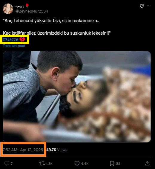 ਸਾਨੂੰ ਇਹ ਤਸਵੀਰ ਇਸ ਮਹੀਨੇ 13 ਅਪ੍ਰੈਲ, 2025 ਨੂੰ ਜ਼ੈਨਬ ਨਾਮ ਦੇ ਇੱਕ X ਹੈਂਡਲ ‘ਤੇ ਅਪਲੋਡ ਮਿਲੀ। ਇਸ ਤਸਵੀਰ ਦੇ ਨਾਲ ਹੈਸ਼ਟੈਗ ‘ਗਾਜ਼ਾ’ ਵਰਤਿਆ ਗਿਆ ਹੈ।