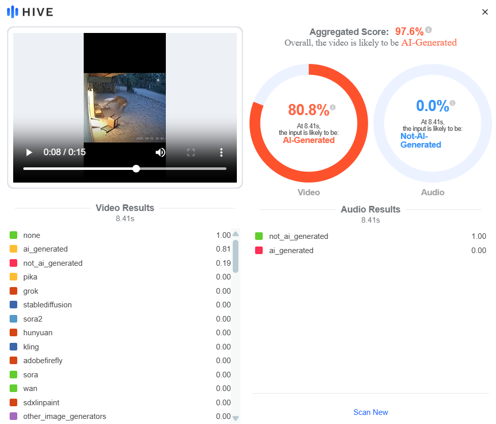 ਇਸ ਲਈ ਅਸੀਂ ਇਸ ਵੀਡੀਓ ਨੂੰ AI ਡਿਟੈਕਸ਼ਨ ਟੂਲਸ Hive Moderation ਅਤੇ Sightengine ‘ਤੇ ਸਰਚ ਕੀਤਾ। Hive Moderation ਦੇ ਮੁਤਾਬਕ, ਇਸ ਵੀਡੀਓ ਦੇ AI-ਜਨਰੇਟਡ ਹੋਣ ਦੀ 97.6 ਪ੍ਰਤੀਸ਼ਤ ਸੰਭਾਵਨਾ ਹੈ। Sightengine ਨੇ ਇਸ ਵੀਡੀਓ ‘ਚ ਇੱਕ ਕੀਫ੍ਰੇਮ ਨੂੰ 90 ਪ੍ਰਤੀਸ਼ਤ AI-ਜਨਰੇਟਡ ਦੱਸਿਆ।