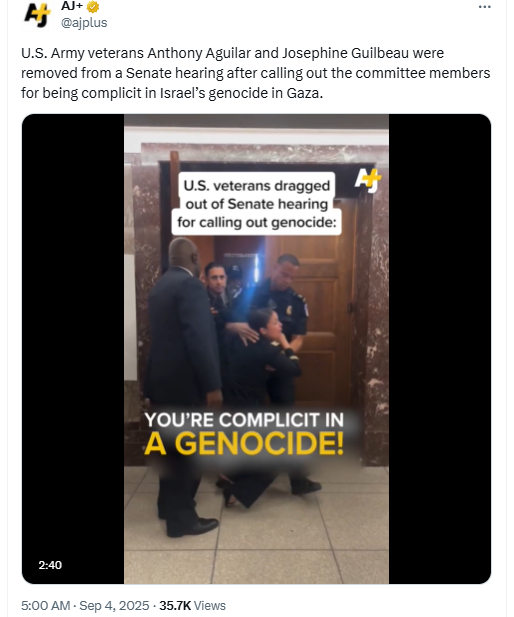 ਵੀਡੀਓ ਦੇ ਨਾਲ ਕੈਪਸ਼ਨ ਵਿੱਚ ਲਿਖਿਆ ਹੈ,”ਅਮਰੀਕੀ ਫੌਜ ਦੇ ਸਾਬਕਾ ਸੈਨਿਕ ਐਂਥਨੀ ਐਗੁਇਲਰ ਅਤੇ ਜੋਸਫਾਈਨ ਗਿਲਬੋਆ ਨੂੰ ਸੈਨੇਟ ਦੀ ਸੁਣਵਾਈ ਵਿੱਚੋਂ ਬਾਹਰ ਕੱਢ ਦਿੱਤਾ ਗਿਆ ਜਦੋਂ ਉਨ੍ਹਾਂ ਨੇ ਕਮੇਟੀ ਮੈਂਬਰਾਂ ‘ਤੇ ਗਾਜ਼ਾ ਵਿੱਚ ਇਜ਼ਰਾਈਲ ਦੁਆਰਾ ਕੀਤੀ ਜਾ ਰਹੀ ਨਸਲਕੁਸ਼ੀ ਵਿੱਚ ਸ਼ਾਮਲ ਹੋਣ ਦਾ ਦੋਸ਼ ਲਗਾਇਆ।”