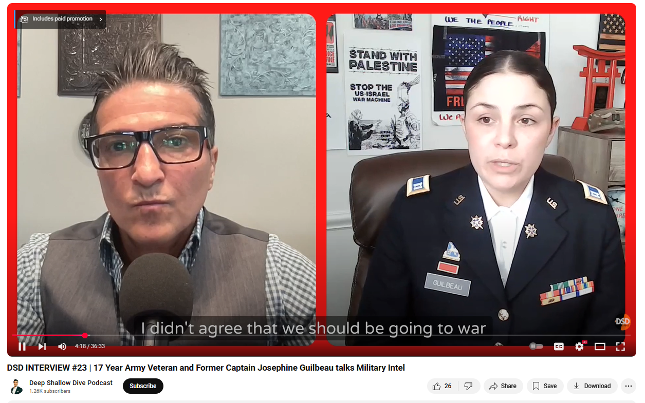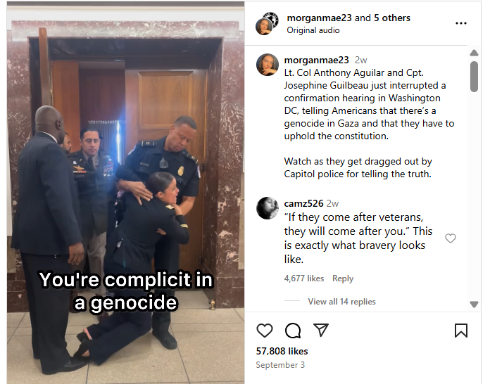 ਇਸ ਤੋਂ ਇਲਾਵਾ ਸਾਨੂੰ 3 ਸਤੰਬਰ, 2025 ਨੂੰ ਇੱਕ ਇੰਸਟਾਗ੍ਰਾਮ ਅਕਾਊਂਟ ਦੁਆਰਾ ਅਪਲੋਡ ਕੀਤਾ ਗਿਆ ਇੱਕ ਵੀਡੀਓ ਮਿਲਿਆ ਜਿਸ ਵਿੱਚ ਵਾਇਰਲ ਵੀਡੀਓ ਦੇ ਕਈ ਦ੍ਰਿਸ਼ ਸਨ। ਵੀਡੀਓ ਦੇ ਨਾਲ ਕੈਪਸ਼ਨ ਵਿੱਚ ਕਿਹਾ ਗਿਆ ਹੈ ਕਿ ਵਾਸ਼ਿੰਗਟਨ, ਡੀਸੀ ਵਿੱਚ ਇੱਕ ਸੁਣਵਾਈ ਦੌਰਾਨ, ਲੈਫਟੀਨੈਂਟ ਕਰਨਲ ਐਂਥਨੀ ਐਗੁਇਲਰ ਅਤੇ ਕੈਪਟਨ ਜੋਸੇਫਾਈਨ ਗਿਲਬੋ ਨੇ ਗਾਜ਼ਾ ਦੇ ਮੁੱਦੇ ਨੂੰ ਚੁਕਿਆ ਜਿਸ ਤੋਂ ਬਾਅਦ ਕੈਪੀਟਲ ਪੁਲਿਸ ਦੁਆਰਾ ਉਨ੍ਹਾਂ ਨੂੰ ਬਾਹਰ ਕੱਢ ਦਿੱਤਾ ਗਿਆ।