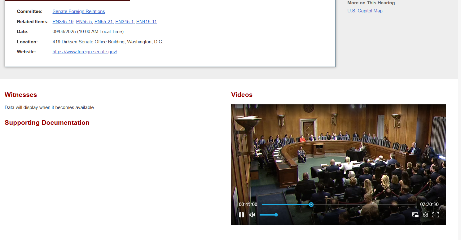 ਸਾਨੂੰ 3 ਸਤੰਬਰ, 2025 ਨੂੰ ਵਿਦੇਸ਼ ਮਾਮਲਿਆਂ ਦੀ ਕਮੇਟੀ ਦੁਆਰਾ ਕੀਤੀ ਗਈ ਸੁਣਵਾਈ ਦਾ ਪੂਰਾ ਵੀਡੀਓ ਅਮਰੀਕੀ ਕਾਂਗਰਸ ਦੀ ਵੈਬਸਾਈਟ ‘ਤੇ ਮਿਲਿਆ। ਇਸ ਲਗਭਗ 2 ਘੰਟੇ ਅਤੇ 20 ਮਿੰਟ ਲੰਬੇ ਵੀਡੀਓ ਵਿੱਚ ਸਾਨੂੰ 43ਵੇਂ ਅਤੇ 45ਵੇਂ ਮਿੰਟ ਦੇ ਵਿਚਕਾਰ ਇੱਕ ਦ੍ਰਿਸ਼ ਮਿਲਿਆ ਜਿੱਥੇ ਸੁਣਵਾਈ ਵਿੱਚ ਵਿਘਨ ਪੈਂਦਾ ਦਿਖਾਈ ਦੇ ਰਿਹਾ ਹੈ। ਹਾਲਾਂਕਿ ਸਾਨੂੰ ਇਸ ਸਮੇਂ ਦੌਰਾਨ ਲੈਫਟੀਨੈਂਟ ਕਰਨਲ ਐਂਥਨੀ ਐਗੁਇਲਰ ਅਤੇ ਕੈਪਟਨ ਜੋਸੇਫਾਈਨ ਗਿਲਬੋ ਦੇ ਚਿਹਰੇ ਨਹੀਂ ਦਿਖਾਈ ਦਿੰਦੇ, ਪਰ ਅਸੀਂ ਉਨ੍ਹਾਂ ਦੇ ਨਾਅਰੇ ਸਾਫ਼ ਸੁਣ ਸਕਦੇ ਹਾਂ ਜੋ ਹੋਰ ਵੀਡੀਓਜ਼ ਵਿੱਚ ਵੀ ਮੌਜੂਦ ਹਨ।