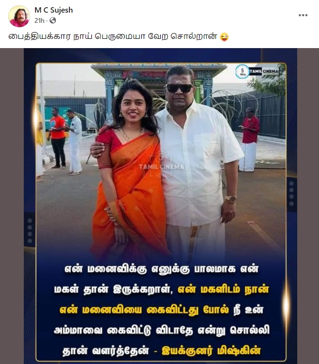 “என் மனைவிக்கு எனக்கு பாலமாக என் மகள் தான் இருக்கறாள், என் மகளிடம் நான் என் மனைவியை கைவிட்டது போல் நீ உன் அம்மாவை கைவிட்டு விடாதே என்று சொல்லி தான் வளர்த்தேன் – இயக்குனர் மிஷ்கின்” என்று இந்த புகைப்படம் பரவி வருகிறது.