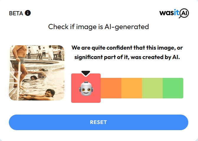 எனவே, AI உருவாக்கங்களைக் கண்டறியும் Wasitai மூலமாக இப்புகைப்படத்தை ஆராய்ந்தபோது இப்புகைப்படம் AI மூலமாக உருவாக்கப்பட்டுள்ளது என்பது நமக்கு உறுதியாகியது.