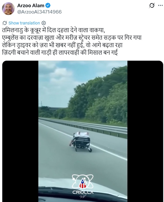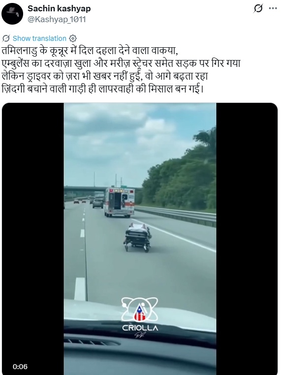குன்னூரில் ஆம்புலன்சில் இருந்து நோயாளி இருந்த படுக்கை தவறி விழுந்ததாக பரவும் வீடியோ AI மூலம் உருவாக்கப்பட்டது என்பது நமக்குக் கிடைத்த ஆதாரங்களின் வாயிலாக தெளிவாகியுள்ளது.