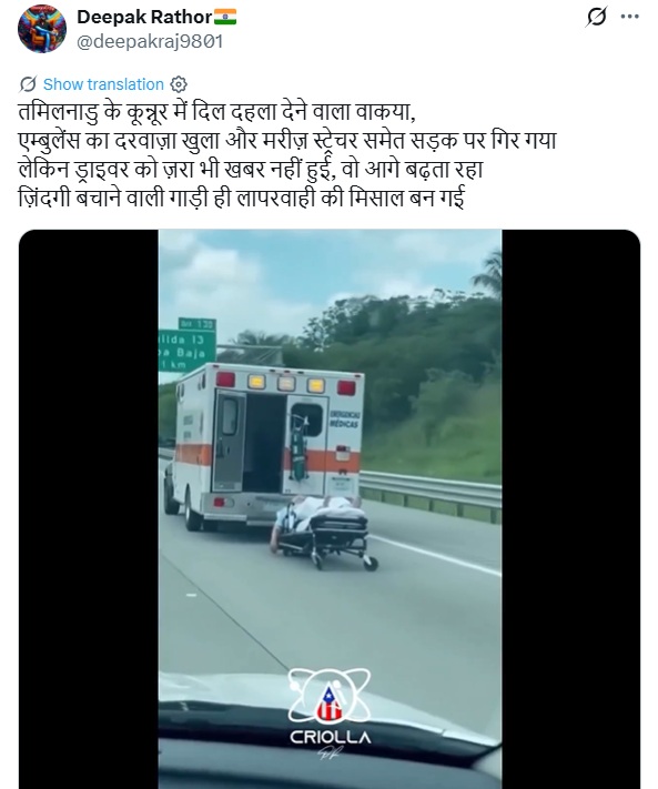 Ivan Velez என்கிற இந்த நபர் ஒரு டிஜிட்டல் கிரியேட்டர் என்பது குறிப்பிடத்தக்கது. அவரது AI உருவாக்க வீடியோவே தற்போது தமிழ்நாடு குன்னூரில் ஆம்புலன்சில் இருந்து தவறி விழுந்த நோயாளியின் படுக்கை என்பதாகப் பரவி வருகிறது.
