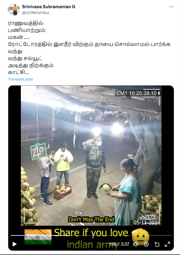 Claim: இளநீர் விற்கும் தாய்க்கு சல்யூட் அடித்த ராணுவ வீரர்