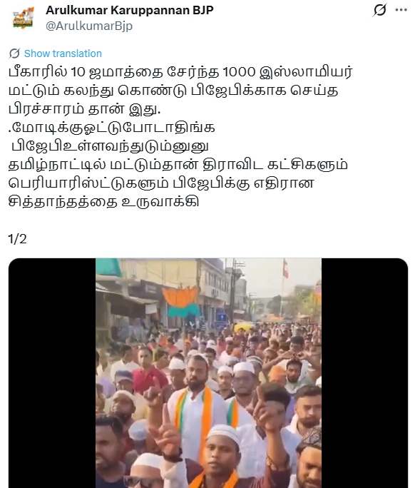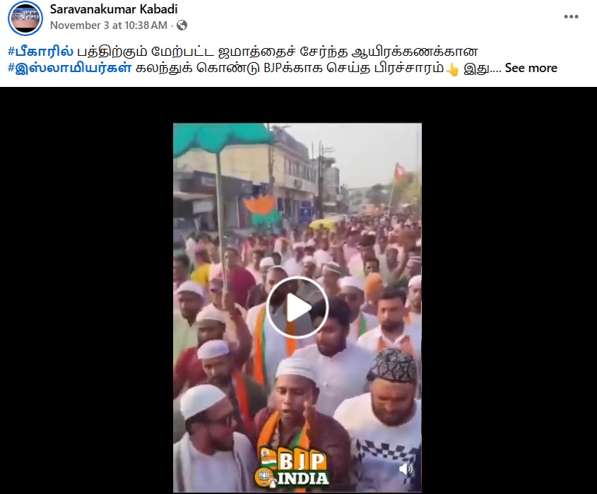 பீகாரில் பாஜகவிற்கு ஆதரவாக களமிறங்கிய இஸ்லாமியர்கள் என்று வீடியோ ஒன்று சமூக வலைத்தளங்களில் பரவி வருகிறது.