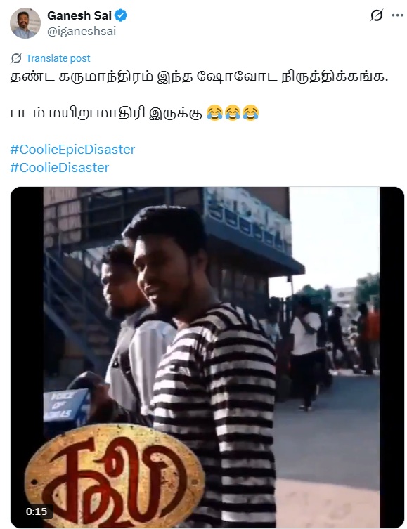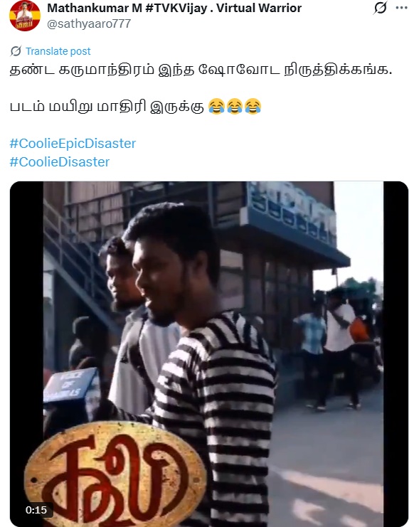 கூலி திரைப்படத்திற்கு கிடைத்த மோசமான ரசிகர் விமர்சனம் என்பதாக வீடியோ ஒன்று சமூக வலைத்தளங்களில் பரவுகிறது.
