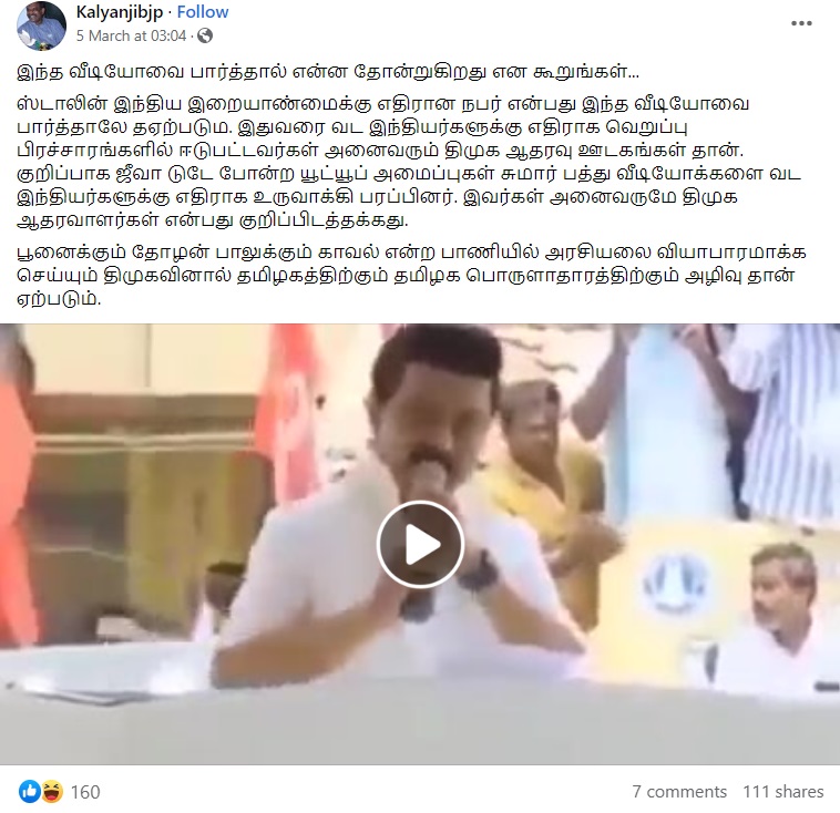 இந்திய இறையாண்மைக்கு எதிராக தமிழ்நாடு முதலமைச்சர் பேசியதாகப் பரவுகின்ற வீடியோ குறித்த உண்மையறிய அதுகுறித்த ஆய்வில் ஈடுபட்டோம்.