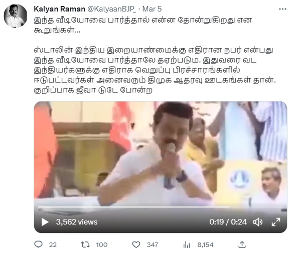 பாஜக தலைவர் அண்ணாமலை முழு வீடியோ ஒன்றின் தொடக்கத்தில் இதைப் பகிர்ந்த நிலையில், பாஜக கல்யாண் ராமன் உள்ளிட்ட பலரும் இந்த வீடியோவைப் பகிர்ந்து வருகின்றனர். “இந்த வீடியோவை பார்த்தால் என்ன தோன்றுகிறது என கூறுங்கள்… ஸ்டாலின் இந்திய இறையாண்மைக்கு எதிரான நபர் என்பது இந்த வீடியோவை பார்த்தாலே ஏற்படும். இதுவரை வட இந்தியர்களுக்கு எதிராக வெறுப்பு பிரச்சாரங்களில் ஈடுபட்டவர்கள் அனைவரும் திமுக ஆதரவு ஊடகங்கள் தான். யூட்யூப் அமைப்புகள் சுமார் பத்து வீடியோக்களை வட இந்தியர்களுக்கு எதிராக உருவாக்கி பரப்பினர். இவர்கள் அனைவருமே திமுக ஆதரவாளர்கள் என்பது குறிப்பிடத்தக்கது. பூனைக்கும் தோழன் பாலுக்கும் காவல் என்ற பாணியில் அரசியலை வியாபாரமாக்க செய்யும் திமுகவினால் தமிழகத்திற்கும் தமிழக பொருளாதாரத்திற்கும் அழிவு தான் ஏற்படும். திமுகவையும் திமுகவின் தோழமை அமைப்புகளையும் ஒழிப்பது சமூகத்தின் தலையாய கடமை” என்று கல்யாண் இந்த வீடியோவைப் பகிர்ந்துள்ளார்.
