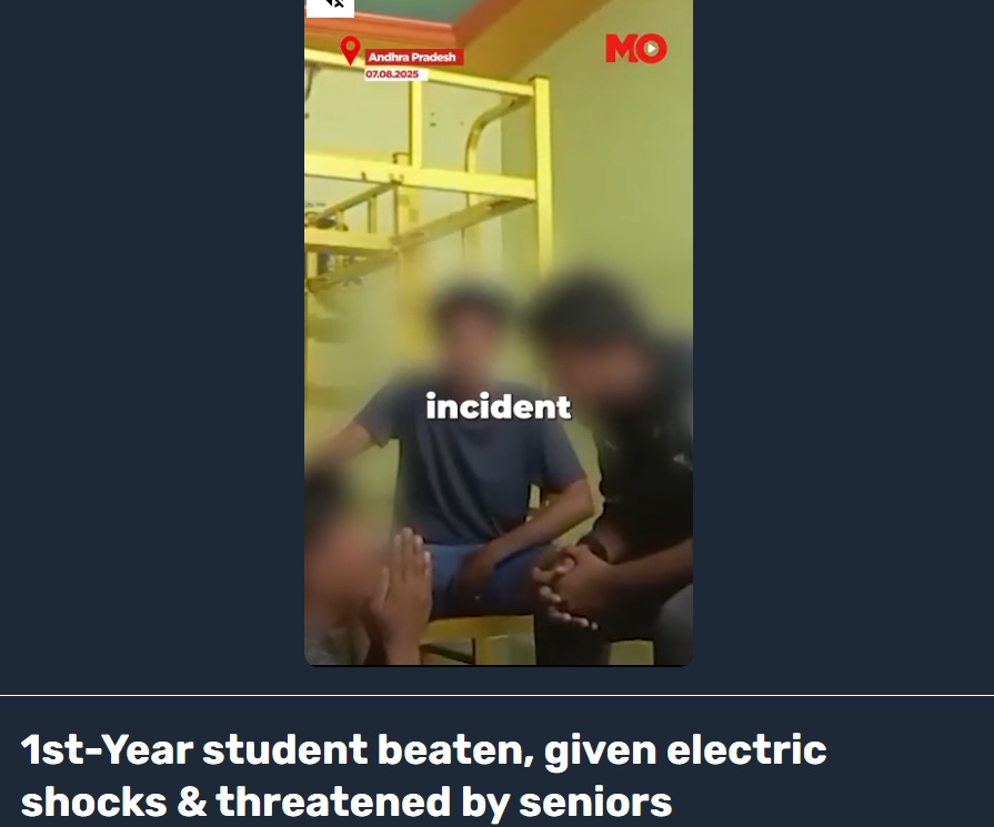 மேலும், India Today கடந்த ஆகஸ்ட் 13, 2025 அன்று இதுகுறித்து வெளியிட்டுள்ள செய்தியில் ஆந்திர மாநிலம்,தாச்சேப்பள்ளி அரசு கல்லூரியில் முதலாம் ஆண்டு கல்வி கற்கும் மாணவர் குடிபோதையில் இருந்த சீனியர் மாணவர்களால் அடித்து துன்புறுத்தப்பட்டு, ஷாக் கொடுக்கப்பட்டதாக செய்தி வெளியாகியுள்ளது.