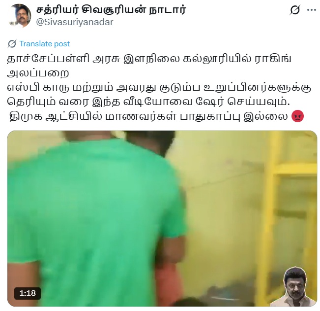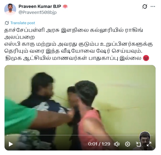 எஸ்பி காரு மற்றும் அவரது குடும்ப உறுப்பினர்களுக்கு தெரியும் வரை இந்த வீடியோவை ஷேர் செய்யவும். திமுக ஆட்சியில் மாணவர்கள் பாதுகாப்பு இல்லை” என்று இந்த வீடியோ பரவுகிறது.
