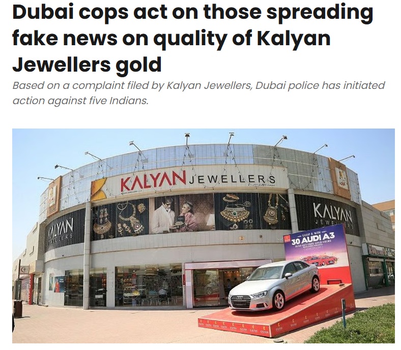 கடந்த மார்ச் 30, 2018 அன்று நியூஸ் மினிட் வெளியிட்டிருந்த “Dubai cops act on those spreading fake news on quality of Kalyan Jewellers gold” என்கிற தலைப்பிலான முழுமையான செய்தி கட்டுரையில் கல்யாண் ஜூவல்லர்ஸ் மீது அவதூறு பரப்பிய 5 பேர் மீது நடவடிக்கை எடுக்க துபாய் பொது வழக்கறிஞர், துபாய் காவல்துறைக்கு உத்தரவிட்டதாக விளக்கமளிக்கப்பட்டுள்ளது. இதுகுறித்த மற்றொரு செய்தியை இங்கே படியுங்கள்.