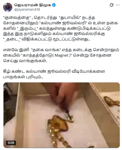 ”*குவைத்தை* , தொடர்ந்து *துபாயில்* நடந்த சோதனையிலும் *கல்யாண் ஜூவல்லரி* ல் உள்ள நகை களில் *_இரும்பு_* கலந்துள்ளது கண்டுபிடிக்கப்பட்டு இந்த இரு நாடுகளிலும் கல்யாண் ஜூவல்லரிக்கு *_தடை_* விதிக்கப்பட்டு மூடப்பட்டுள்ளது.. எனவே இனி *நகை வாங்க* எந்த கடைக்கு சென்றாலும் கையில் *காந்தத்தோடு( Magnet )* சென்று சோதனை செய்து வாங்குங்கள். கீழ் கண்ட கல்யாண் ஜூவல்லரி வீடியோக்களை பாருங்கள் புரியும்..” என்று இந்த வீடியோ பரவுகிறது.