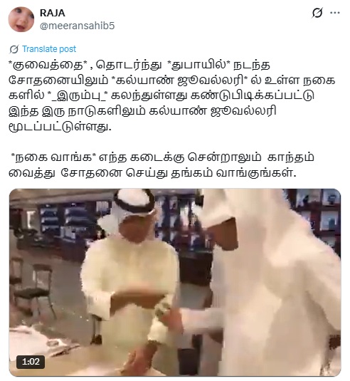 துபாய் கல்யாண் ஜூவல்லர்ஸ் நகை கடை சோதனையில் போலி தங்கம் பிடிபட்டது என்பதாக வீடியோ ஒன்று சமூக வலைத்தளங்களில் பரவி வருகிறது.