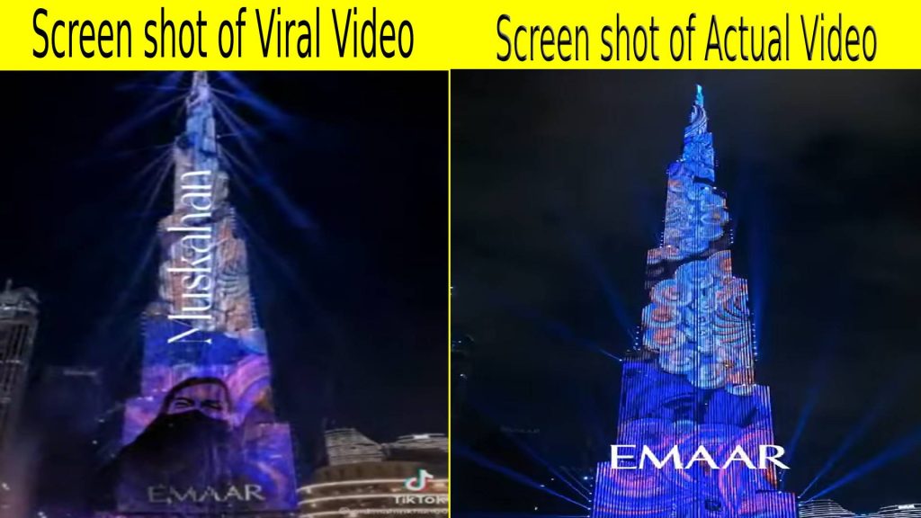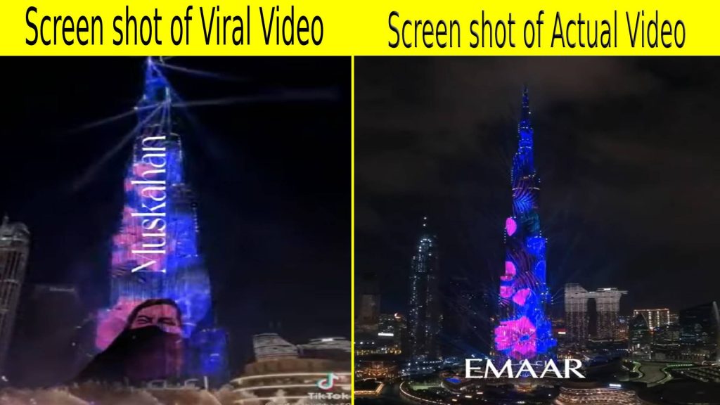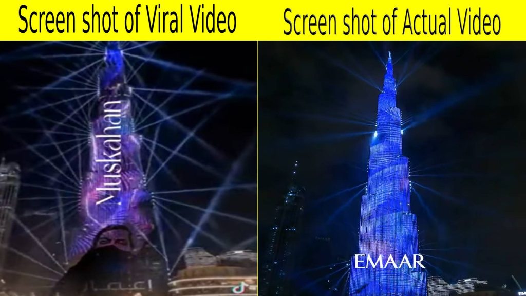 தொடர்ந்து, குறிப்பிட்ட வைரல் வீடியோவில் புர்ஜ் கலிபா கட்டிடம் மறைந்து வீடியோ முடிவடைந்த பிறகும் முஷ்கான் என்கிற பெயர் வீடியோவில் அப்படியே இடம்பெற்றுள்ளது. கட்டிடத்திற்கும், பெயருக்கும் தொடர்பில்லாமல் பெயர் மட்டும் தனியாக வீடியோ கடைசியில் மிளிர்கிறது.