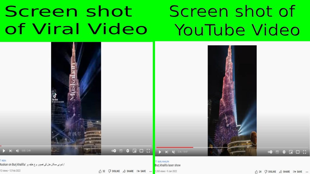 “புர்ஜ் கலிபா”வில் முஸ்கான் கவுரவிக்கப்பட்டார்” என்பதாக வீடியோ ஒன்று சமூக வலைத்தளங்களில் வைரலாகிறது.