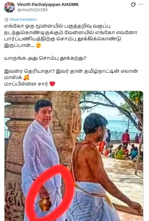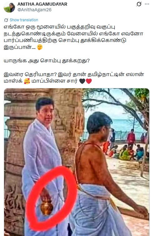“எங்கோ ஒரு மூளையில் பகுத்தறிவு வகுப்பு நடந்துகொண்டிருக்கும் வேளையில் எங்கோ எவனோ பார்ப்பணியத்திற்கு சொம்பு தூக்கிக்கொண்டு இருப்பான்…யாருங்க அது சொம்பு தூக்கறது? இவரை தெரியாதா? இவர் தான் தமிழ்நாட்டின் எலான் மாஸ்க் மாப்பிள்ளை சார்” என்று இந்த புகைப்படம் பரவுகிறது.