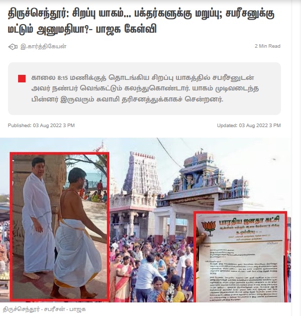 வைரலாகும் புகைப்படத்தை ரிவர்ஸ் சர்ச் முறைக்கு உள்ளாக்கியபோது கடந்த ஆகஸ்ட் 03, 2022 அன்று விகடனில் வெளியாகியிருந்த ”திருச்செந்தூர்: சிறப்பு யாகம்… பக்தர்களுக்கு மறுப்பு; சபரீசனுக்கு மட்டும் அனுமதியா?- பாஜக கேள்வி” என்ற செய்தி கட்டுரையில் இந்த புகைப்படம் இடம்பெற்றிருந்தது. ஆனால், அவருடைய கைகளில் சொம்பு எதுவும் இடம்பெற்றிருக்கவில்லை.
