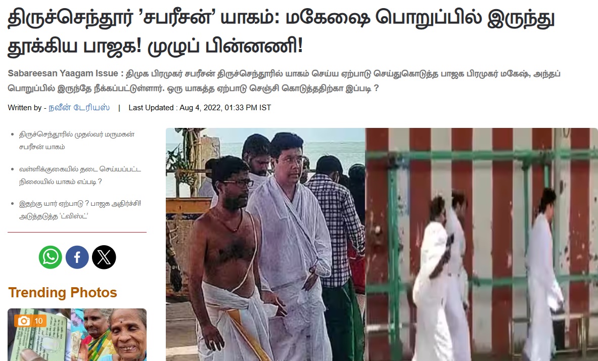மேலும், “திருச்செந்தூர் ’சபரீசன்’ யாகம்: மகேஷை பொறுப்பில் இருந்து தூக்கிய பாஜக! முழுப் பின்னணி!” என்று zee News செய்தியில் இந்த புகைப்படம் இடம்பெற்றிருந்தது. அதிலும், அவரது கைகளில் சொம்பு போன்ற எதுவும் இல்லை.