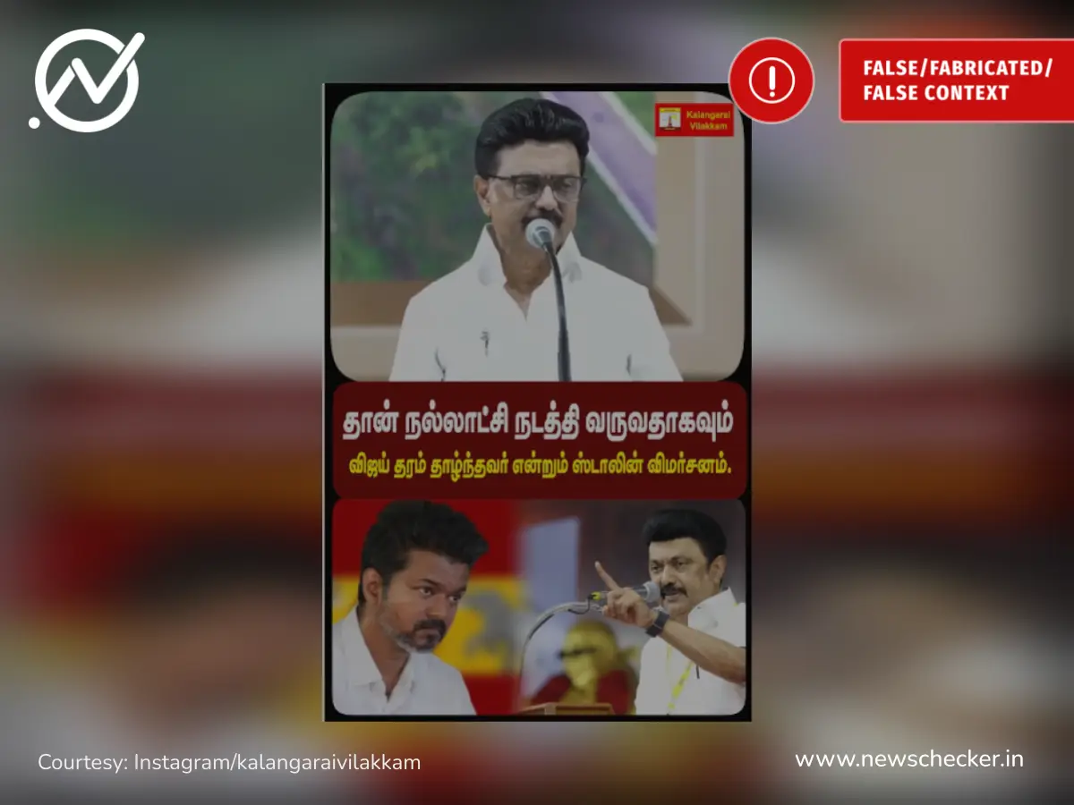 தவெக தலைவர் விஜய் தரம் தாழ்ந்து பேசி வருகின்றார் என்று முதலமைச்சர் ஸ்டாலின் கூறியதாக பரவும் வீடியோ தவறானதாகும்.