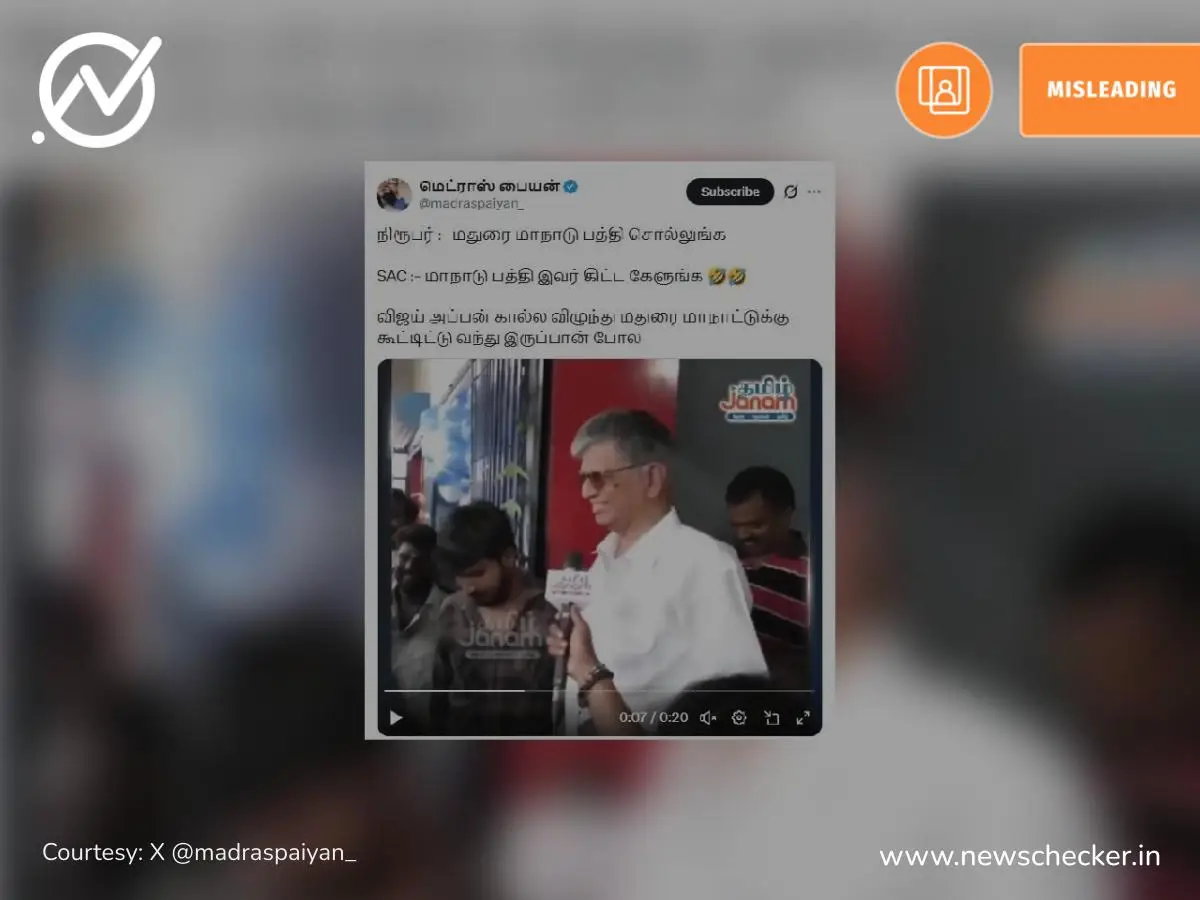 மதுரை தவெக மாநாடு குறித்து பதிலளிக்க மறுத்த விஜய் தந்தை எஸ்.ஏ.சந்திரசேகர் என்று பரவும் வீடியோ கடந்த 2024ஆம் ஆண்டில் எடுக்கப்பட்டதாகும்.