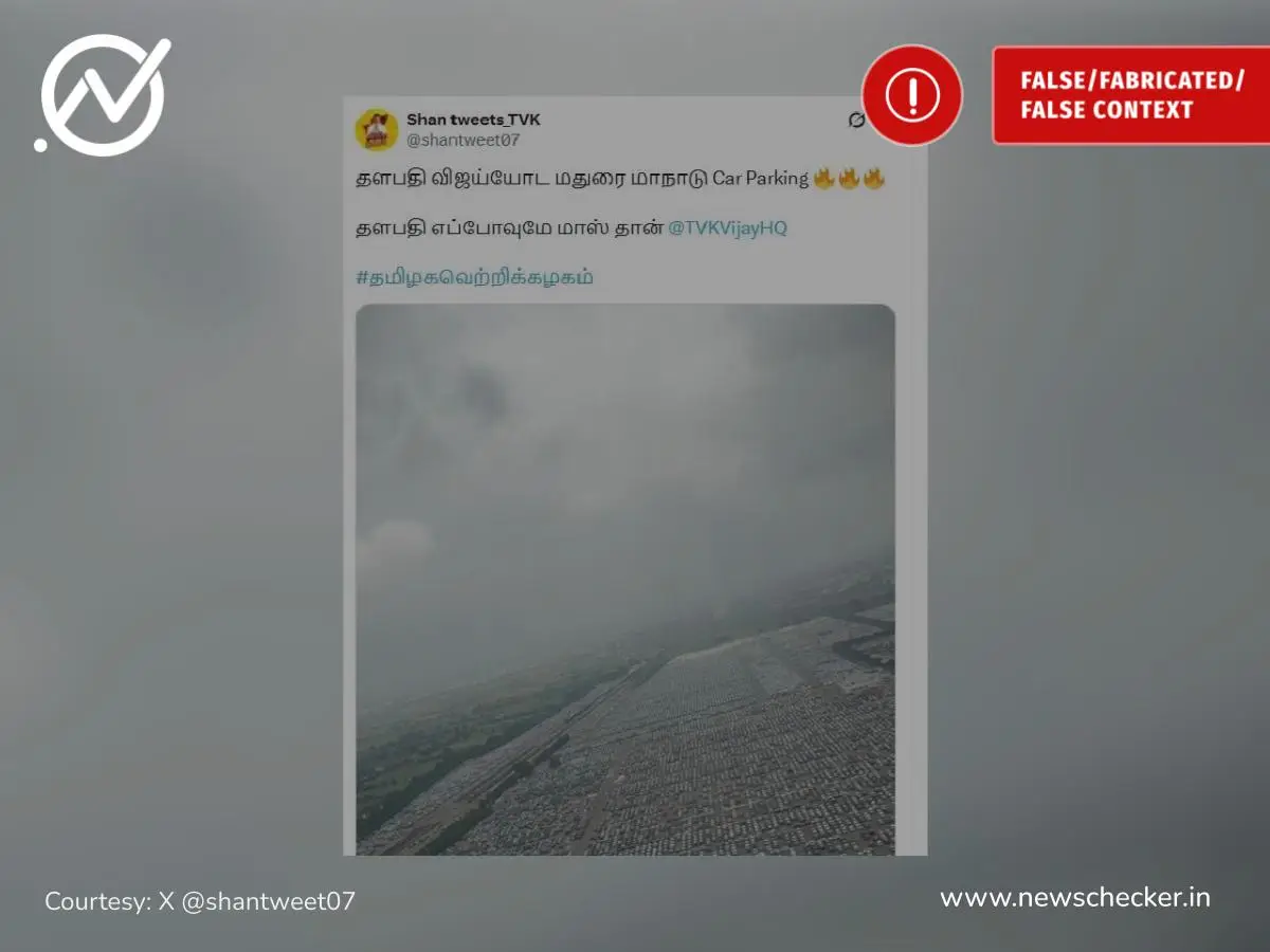 தவெக மதுரை மாநாட்டின் கார் பார்க்கிங்கில் குவிந்திருந்த வாகனங்கள் என்று பரவும் புகைப்படம் தவறானதாகும்.