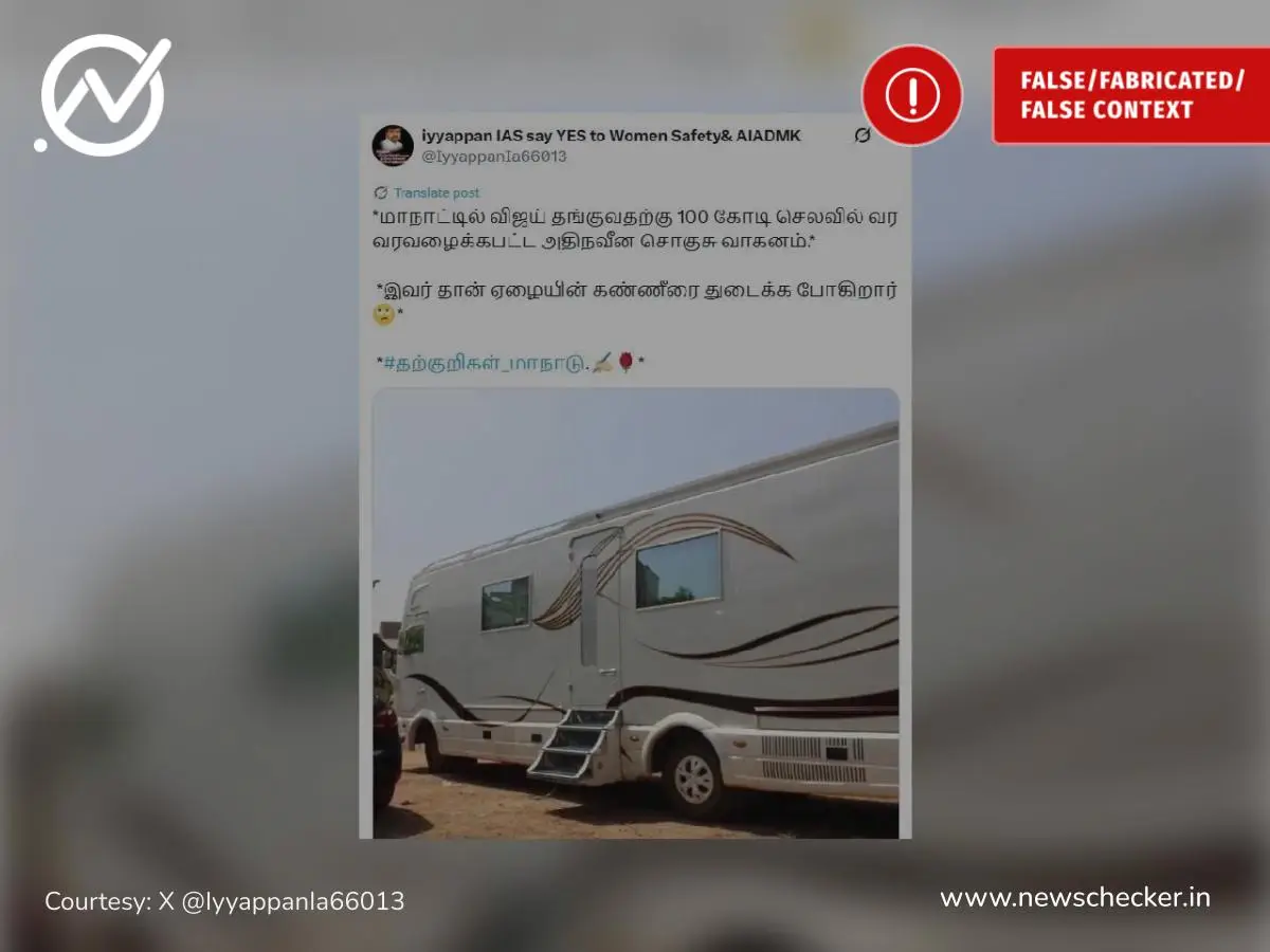 தவெக தலைவர் விஜய் மாநாட்டில் கலந்து கொள்வதற்காக வாங்கிய கேரவன் என்று பரவும் புகைப்படம் தவறானதாகும்.