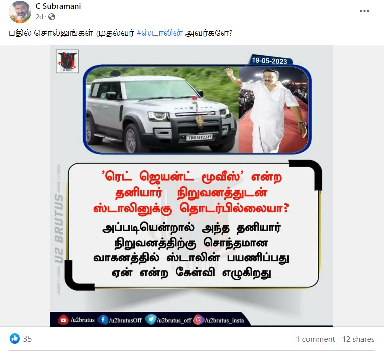 “ரெட் ஜெயன்ட் மூவிஸ் என்ற தனியார் நிறுவனத்துடன் ஸ்டாலினுக்கு தொடர்பில்லையா? அப்படியென்றால் அந்த தனியார் நிறுவனத்திற்கு சொந்தமான வாகனத்தில் ஸ்டாலின் பயணிப்பது ஏன் என்ற கேள்வி எழுகிறது” என்று U2Brutus மைனர் வீரமணி கேள்வி எழுப்பியதாக அப்புகைப்படம் பரவி வருகிறது.