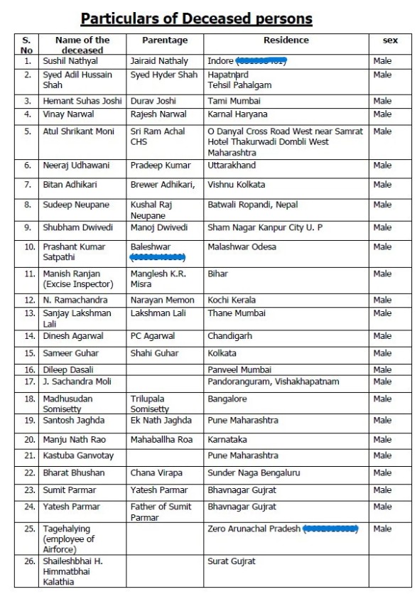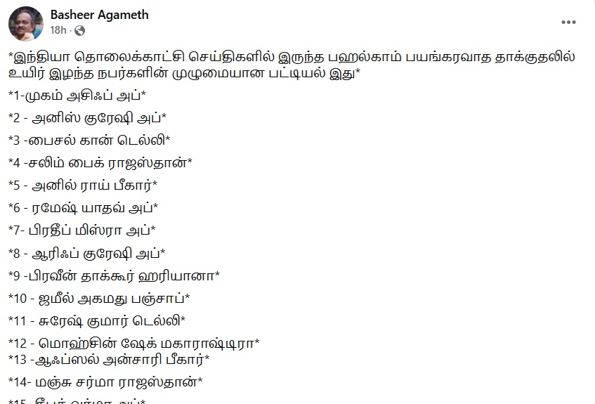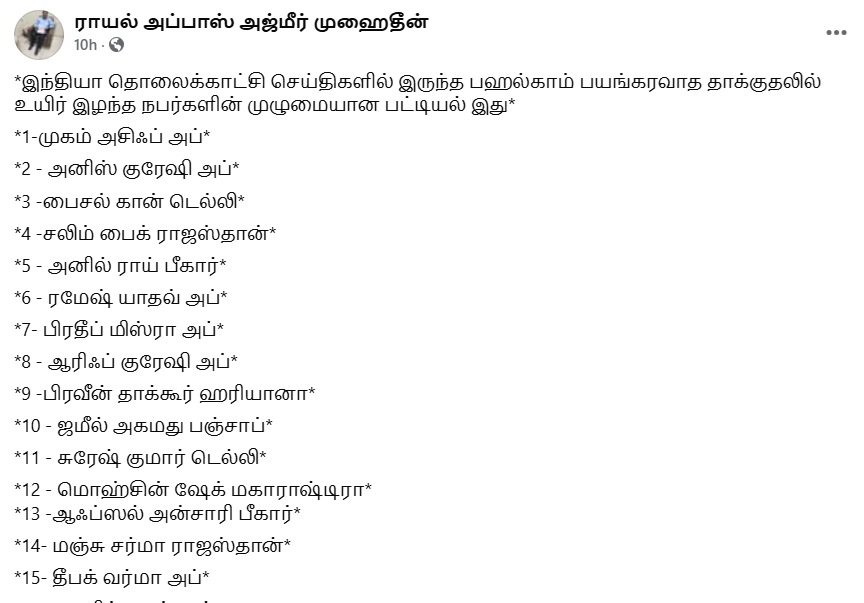 பஹல்கம் தாக்குதலில் உயிரிழந்தவர்களின் பட்டியல் என்று தகவல் ஒன்று சமூக வலைதளங்களில் பரவி வருகிறது.