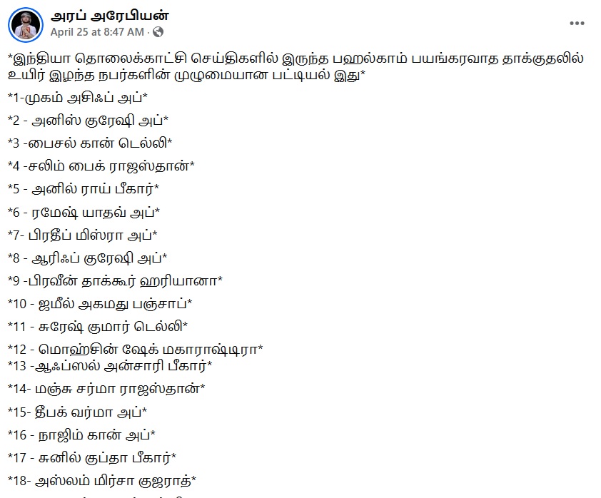 “இந்தியா தொலைக்காட்சி செய்திகளில் இருந்த பஹல்காம் பயங்கரவாத தாக்குதலில் உயிர் இழந்த நபர்களின் முழுமையான பட்டியல் இது” என்று இந்த தகவல் பரவுகிறது.