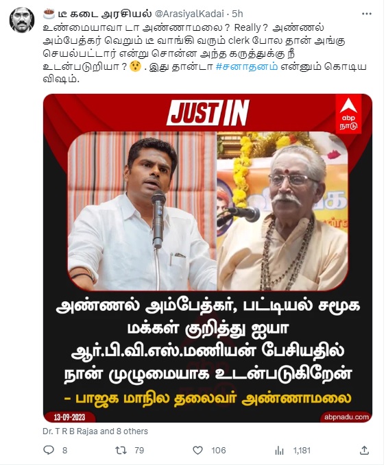 ”உண்மையாவா டா அண்ணாமலை ? Really ? அண்ணல் அம்பேத்கர் வெறும் டீ வாங்கி வரும் clerk போல தான் அங்கு செயல்பட்டார் என்று சொன்ன அந்த கருத்துக்கு நீ உடன்படுறியா ? . இது தான்டா #சனாதனம் என்னும் கொடிய விஷம்.” என்கிற பதிவுடன் இந்த நியூஸ்கார்ட் வைரலாகிறது.