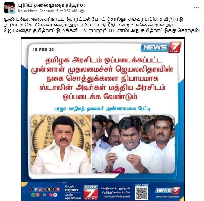 Facebook Post From, News 7 Tamil, Dated February 15, 2025