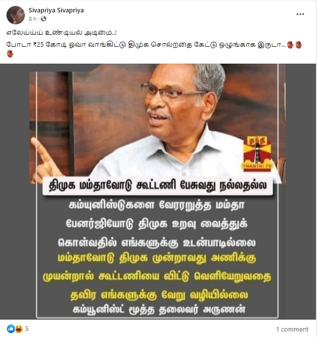 “திமுக மம்தாவோடு கூட்டணி பேசுவது நல்லதல்ல. கம்யூனிஸ்டுகளை வேரறுத்த மம்தா பானர்ஜியோடு திமுக உறவு வைத்துக் கொள்வதில் எங்களுக்கு உடன்பாடில்லை. மம்தாவோடு திமுக மூன்றாவது அணிக்கு முயன்றால் கூட்டணியை விட்டு வெளியேறுவதைத் தவிர எங்களுக்கு வேறு வழியில்லை” என்று கம்யூனிஸ்ட் கட்சியைச் சேர்ந்த அருணன் கூறியதாக நியூஸ்கார்ட் ஒன்று பரவி வருகிறது.