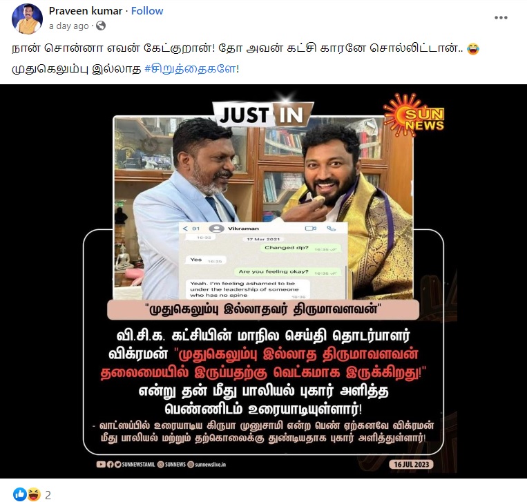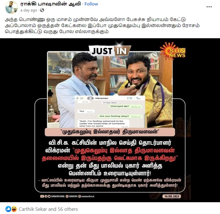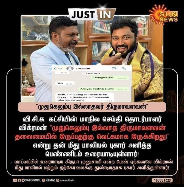 “முதுகெலும்பு இல்லாதவர் திருமாவளவன், வி.சி.க. கட்சியின் மாநில செய்தி தொடர்பாளர் விக்ரமன் “முதுகெலும்பு இல்லாத திருமாவளவன் தலைமையில் இருப்பதற்கு வெட்கமாக இருக்கிறது!” என்று தன் மீது பாலியல் புகார் அளித்த பெண்ணிடம் உரையாடியுள்ளார்!- வாட்ஸப்பில் உரையாடிய கிருபா முனுசாமி என்ற பெண் ஏற்கனவே விக்ரமன் மீது பாலியல் மற்றும் தற்கொலைக்கு துண்டியதாக புகார் அளித்துள்ளார்!” என்று இந்த நியூஸ்கார்ட் பரவி வருகிறது.