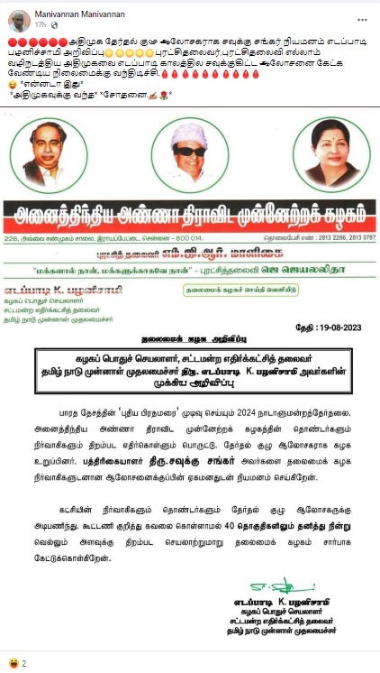 சவுக்கு சங்கர் அதிமுகவின் தேர்தல் குழு ஆலோசகராக நியமிக்கப்பட்டுள்ளதாகப் பரவும் அறிக்கை பற்றிய உண்மையறிய அதுபற்றிய ஆய்வில் ஈடுபட்டோம்.
