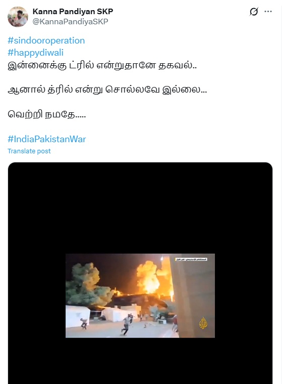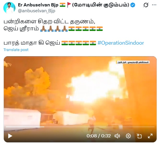 குறிப்பிட்ட வீடியோவையே தற்போது இந்திய ராணுவம் பாகிஸ்தான் ஆக்கிரமிப்பு காஷ்மீர் பகுதியில் அமைந்துள்ள 9 பயங்கரவாத முகாம்களைக் குறிவைத்து நடத்திய ஆபரேஷன் சிந்தூர் தாக்குதலின் காட்சி என்று பரப்பி வருகின்றனர் என்பது நமக்கு உறுதியாகியது.