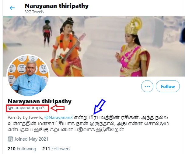வாசகர்களின் புரிதலுக்காக நாராயணன் திருப்பதி அவர்களின் உண்மையான டிவிட்டர் கணக்கையும், அவர் பெயரில் இயங்கும் போலி கணக்கையும் கீழே ஒப்பிட்டுக் காட்டியுள்ளோம்.